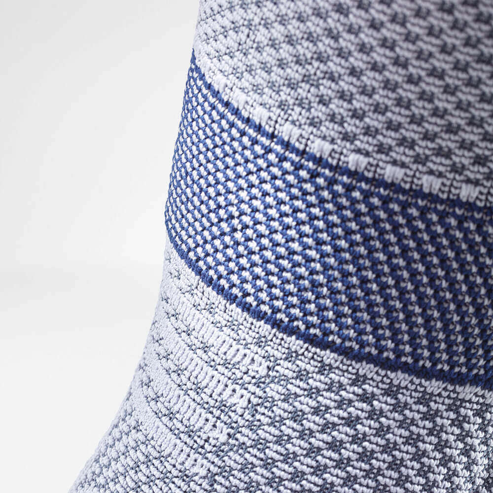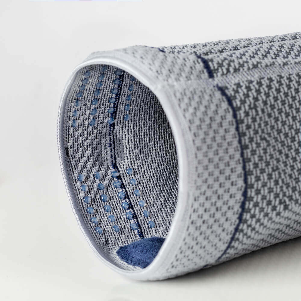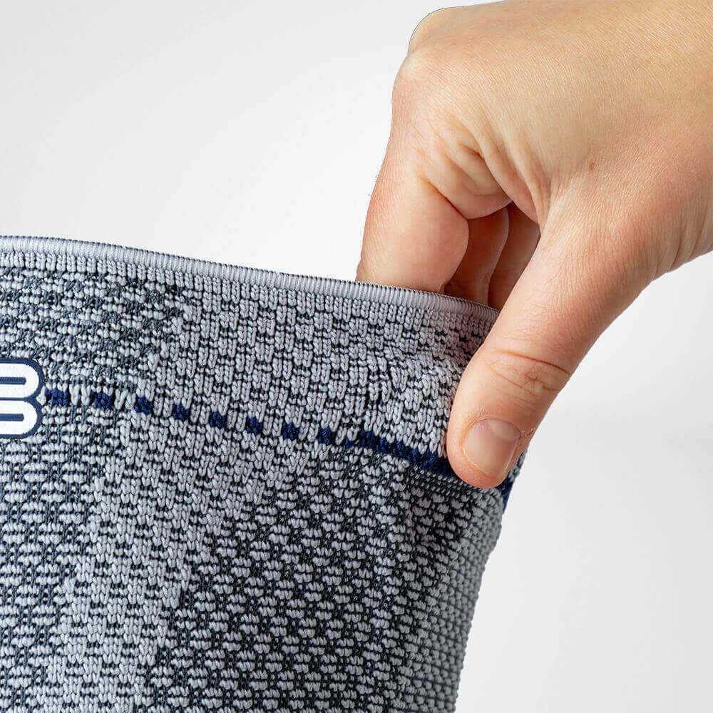 Das Train-Gestrick zeichnet sich durch die medizinische Kompression und eine hohe Atmungsaktivität aus. Im Bereich der Kniekehle und Wade sorgen besonders elastische Dehnzonen für eine hohe Bewegungsfreiheit und einen lang anhaltenden Tragekomfort. Druckempfindliche Personen profitieren außerdem von den angenehm weichen Randbereichen. Die Punkt-Silikonisierung an der Innenseite des oberen Bandagenrandes gewährleistet den sicheren Halt der GenuTrain A3 während Alltagsaktivitäten oder therapeutischen Übungen – auch bei schwachem Bindegewebe. Die seitlich integrierten Anziehhilfen der Kniearthrose-Bandage lassen sich gut greifen und erlauben dadurch ein leichtes Handling mit geringem Kraftaufwand.